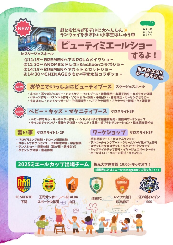 習いごと体験、フットサル大会、ファッションショー、ベビー・キッズ・マタニティブース、ゼミ生によるスタンプラリーに車展示、子どもたちが1日遊んで学べる、どこにもないスペシャルなフェスをミエールゼミ生、本気の大人たちと一緒に開催。