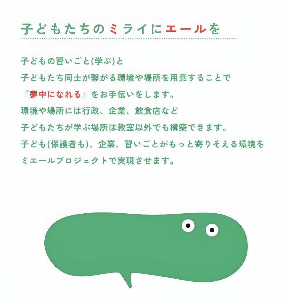 ミエールプロジェクトは、子ども・保護者・企業・習いごとや地域とつながり、学校では教わらない学びと体験を通して、子どもたちが夢中になるきっかけをつくっています。
